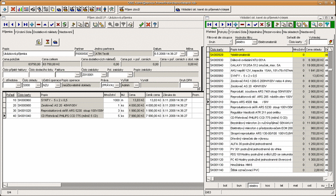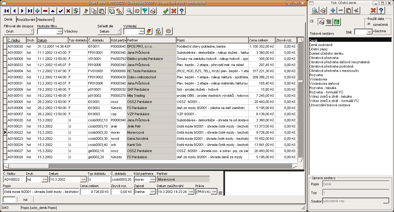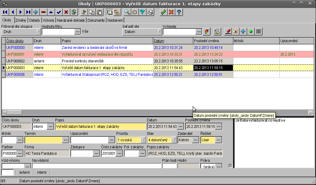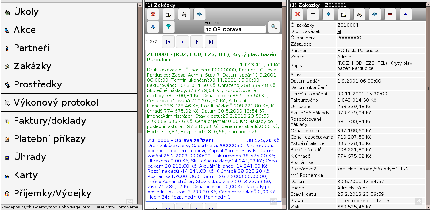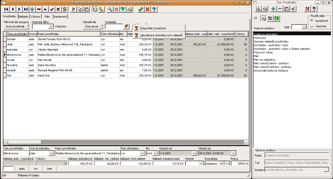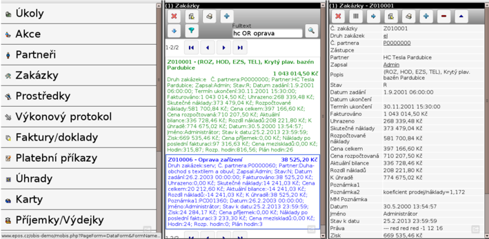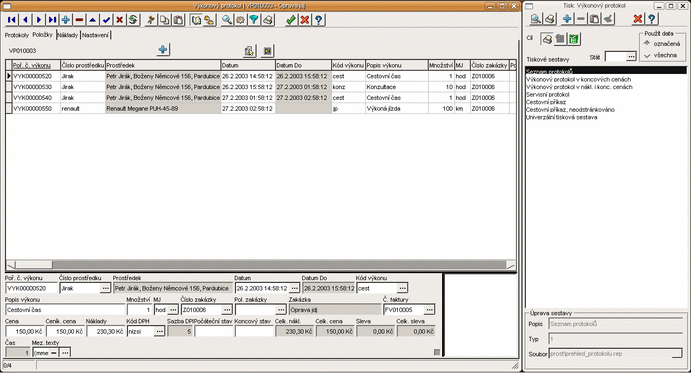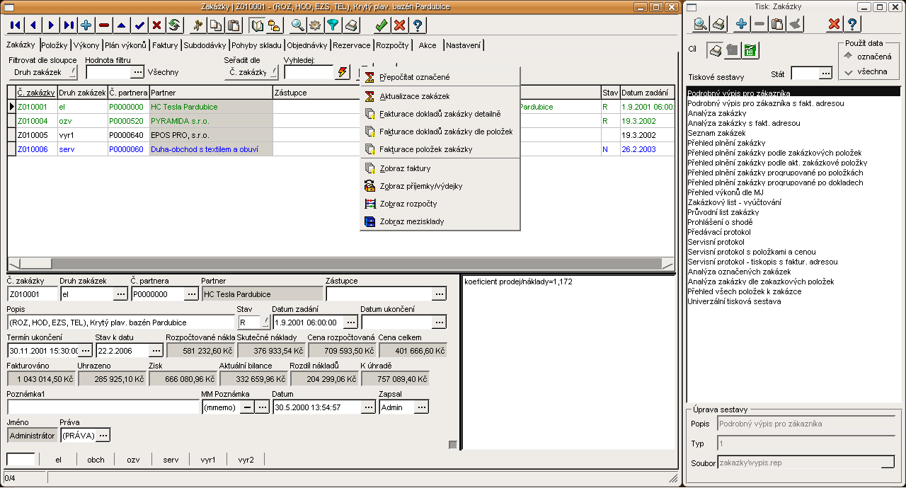 Evidence zakázek, funkce lokálního menu a tiskové sestavy